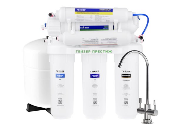 Технология обратного осмоса, использованная в фильтре Гейзер Престиж, заключается в фильтрации воды через полупроницаемую мембрану. Размеры пор мембраны настолько малы, что пропускают только молекулы воды. Размер молекул большинства примесей, а также бактерий и вирусов значительно больше молекул воды, поэтому они не проходят через мембрану. Система работает при давлении в подводящей магистрали не менее 3 атм.