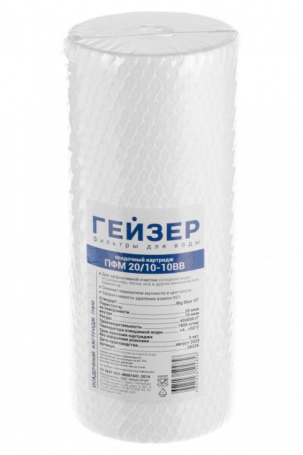 Картридж ПФМ 20/10 10BB предназначен для очистки воды от нерастворимых примесей. В отличие от PP обладают градиентной пористостью: диаметр поры уменьшается при движении воды внутрь картриджа, позволяя работать всему объему фильтрующего материала. У картриджей есть модификации для горячей воды. Не восстанавливаются и не регенерируется.